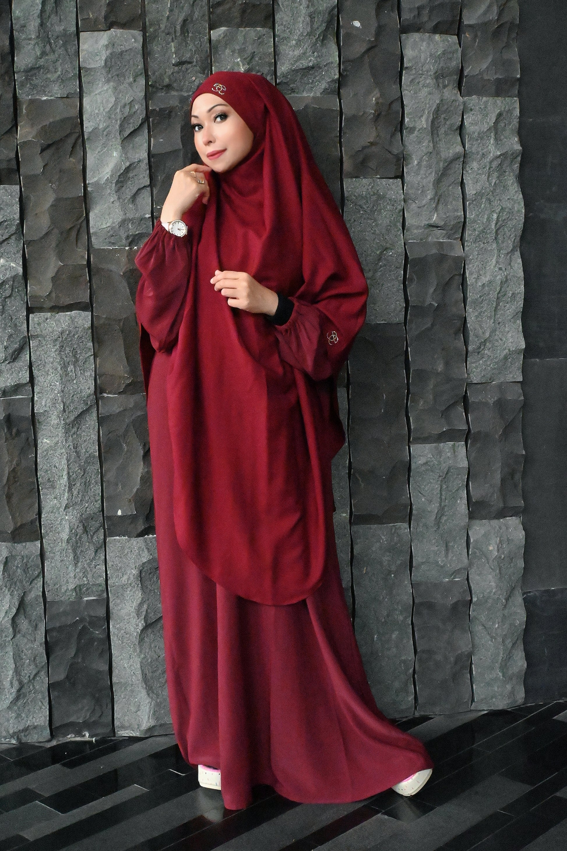 Simplw flowy nidha material with hand gathers . Set include with shawl . Not khimar.