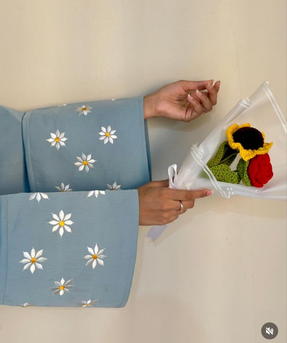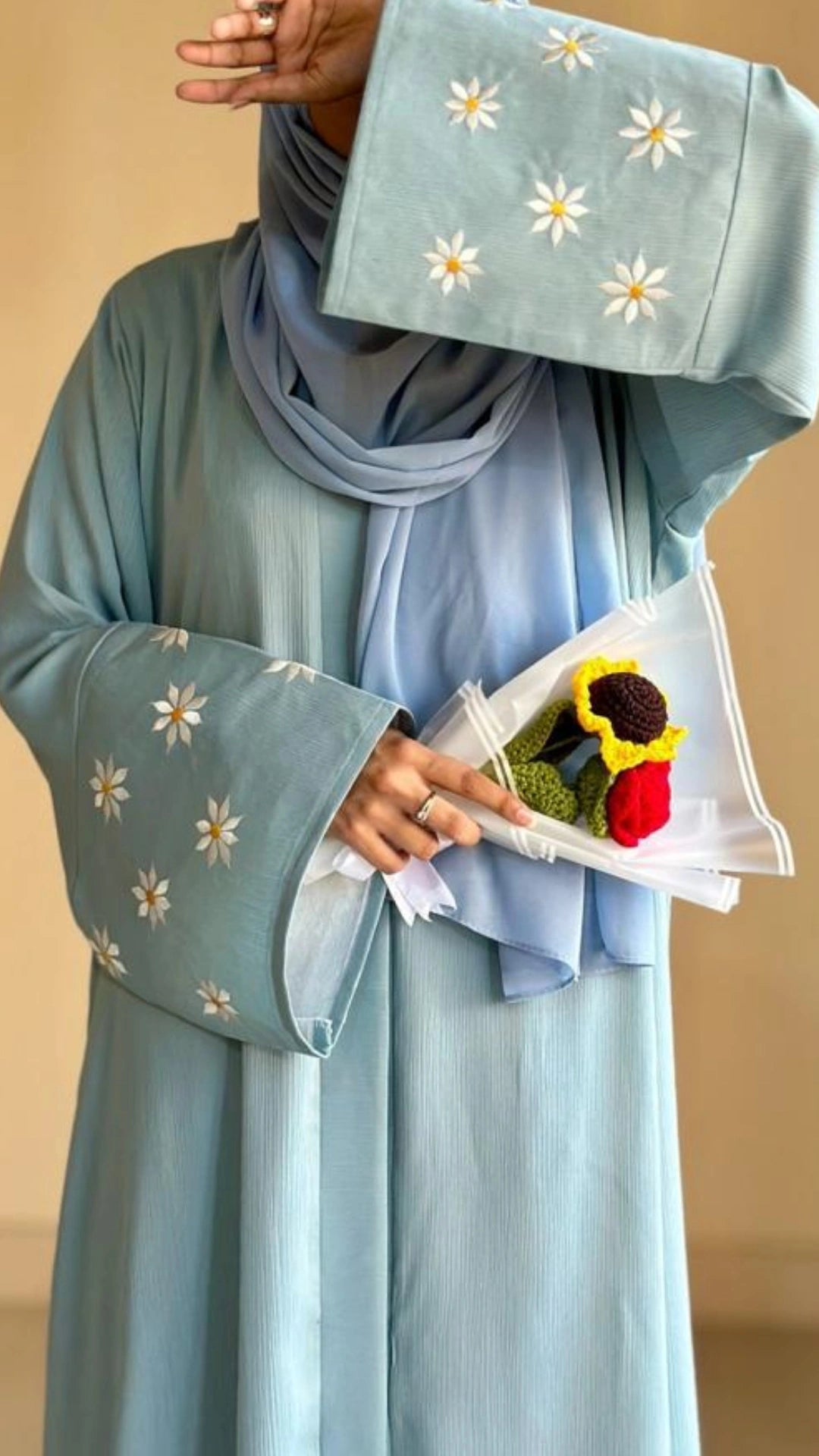 Made from nida fabric, known for its lightweight, soft texture and elegant drape, this ice blue abaya is a must have in your wardrobe.The cool ice blue color in an abaya is a striking and refreshing choice, perfect for creating a modern and sophisticated look specially in summers. Fine embroidery by cotton threads to create vibrance of the abaya.